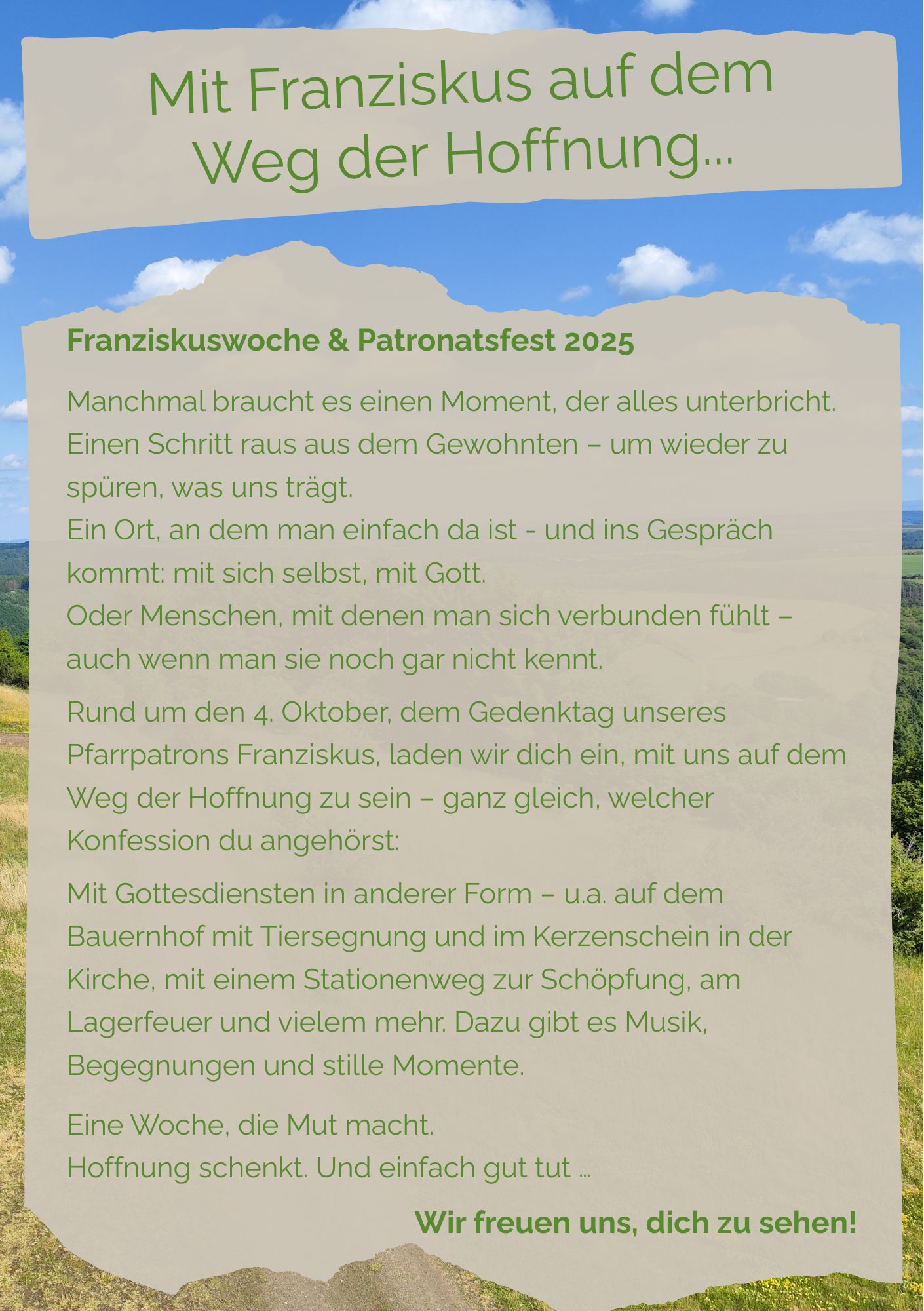 Im Blick auf das Vorbild unseres Pfarrpatrons, des heiligen Franziskus, wollen wir unseren Glauben in Gemeinschaft leben und gestalten.